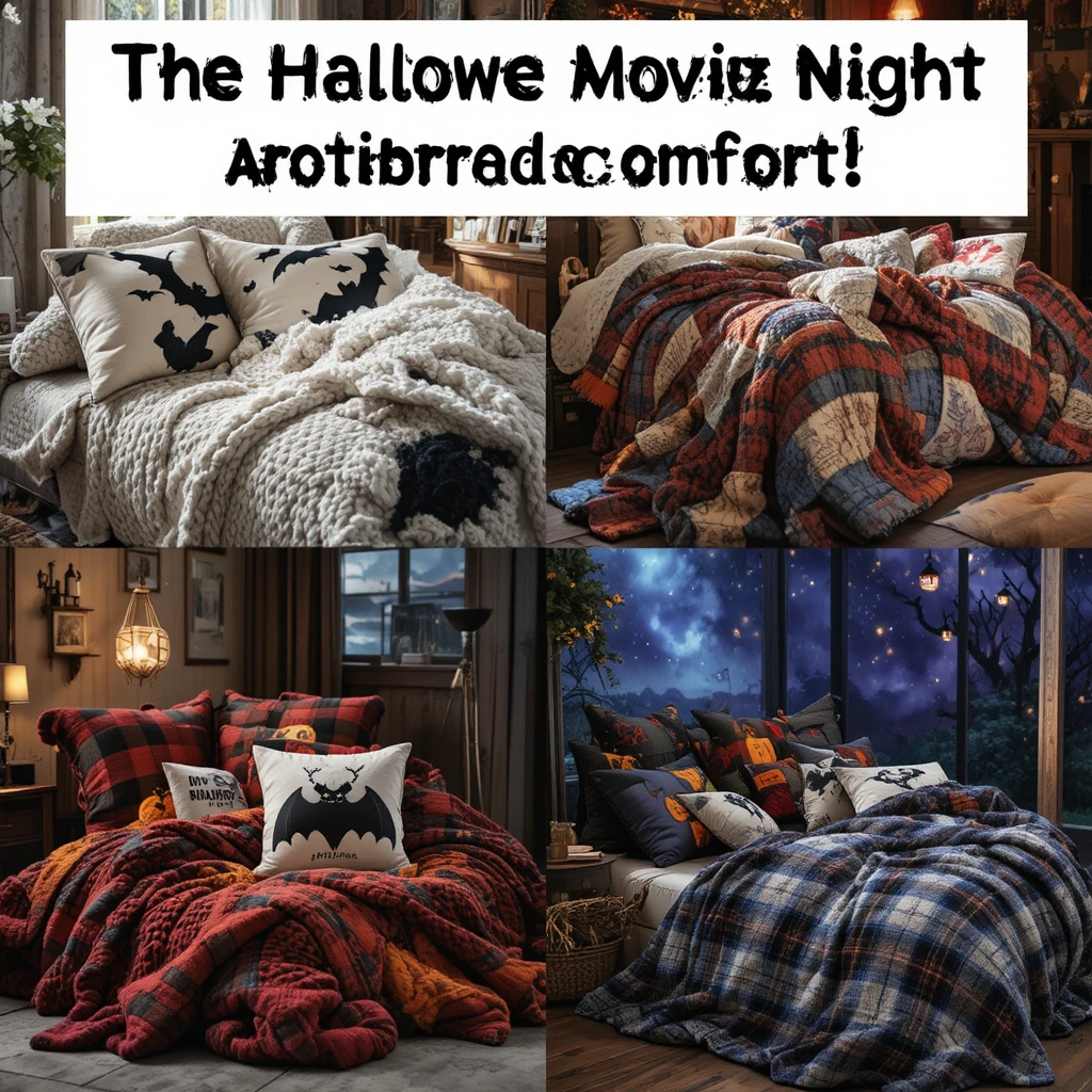 The Halloween movie night aesthetic isn’t complete without comfort. Pile on chunky knit blankets, plaid throws, and cushions with Halloween motifs like bats, pumpkins, or skulls. A cozy nest of blankets makes the perfect backdrop for a long movie marathon.