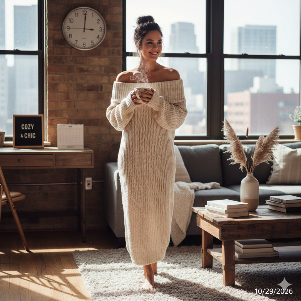 For colder weather, an off-shoulder knit sweater dress gives a cozy, romantic aesthetic while still showing skin in a classy way.