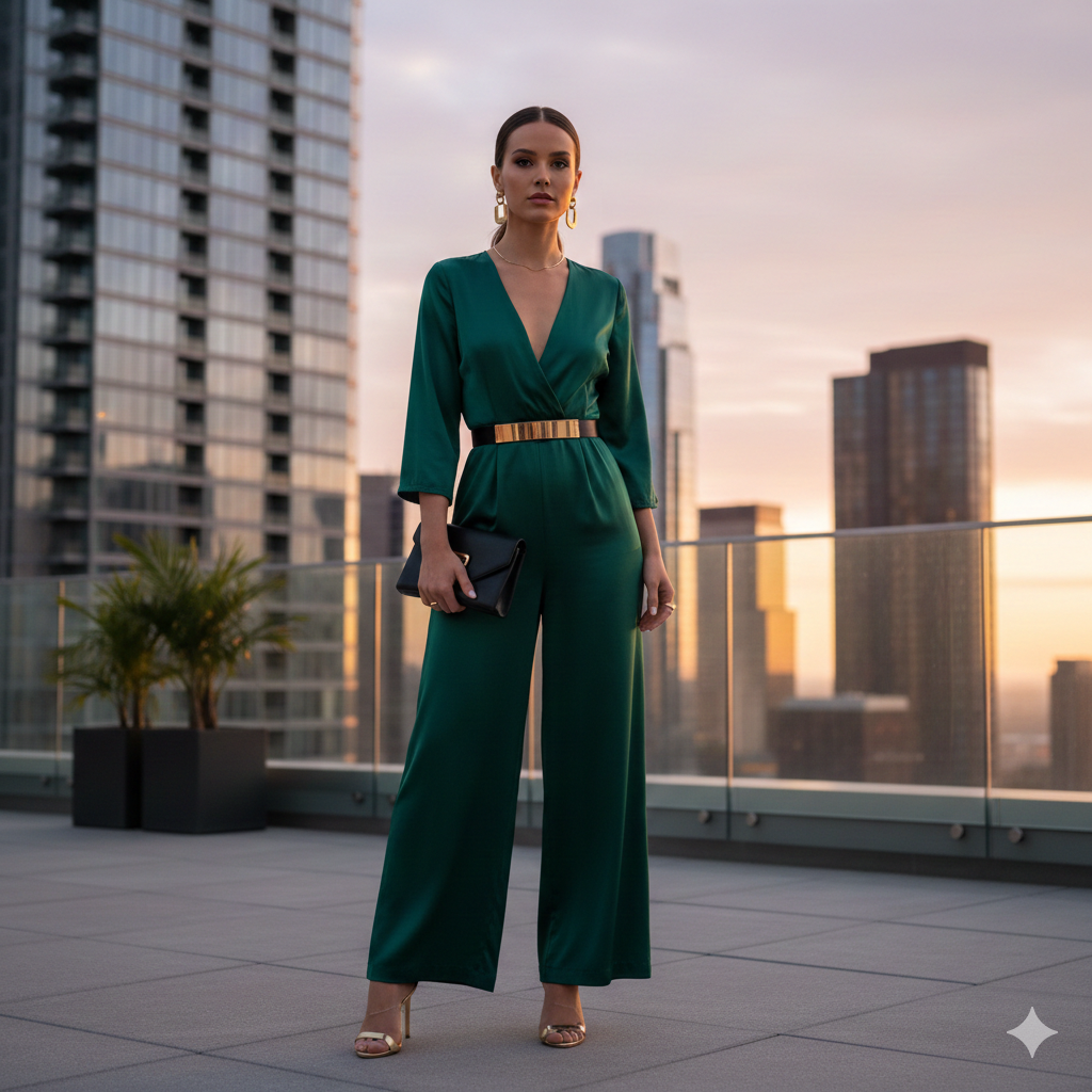 A tailored jumpsuit in red, black, or blush pink is modern, flattering, and comfortable.