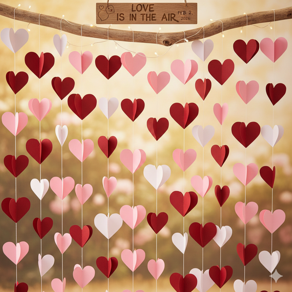 Cut dozens of small hearts and hang them vertically from the ceiling. Stand in front of it and you have a ready-made happy valentines day background frame that looks delicate and romantic in photos.
