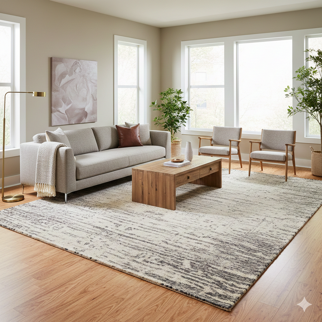 Layering a small rug over a larger neutral rug creates an even more inviting look.