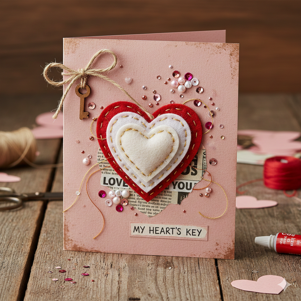 Combine paper, fabric, ribbon, and glitter to make a textured creative valentine card DIY project. Mixed materials give a premium handmade feel.