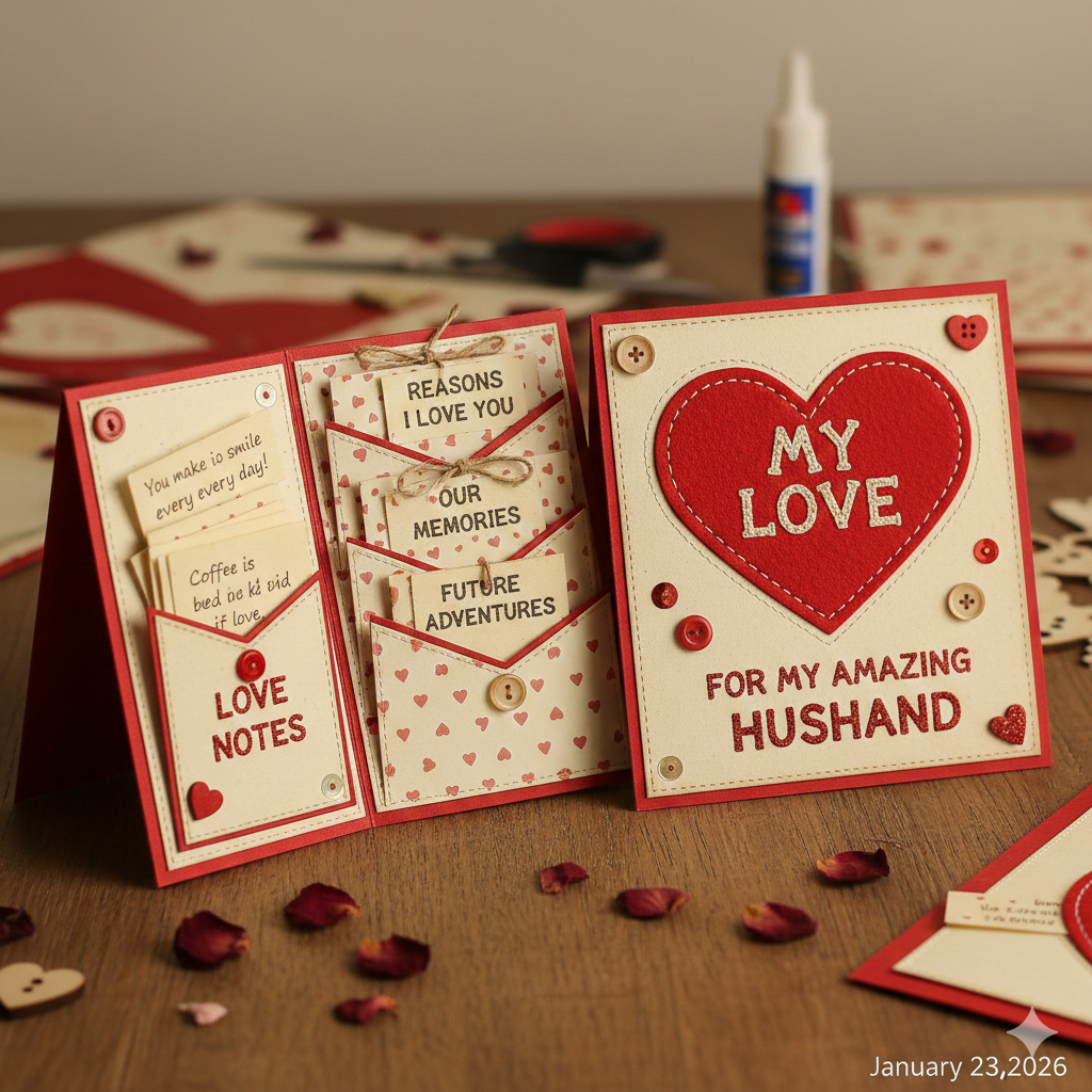 Create tiny paper pockets inside the card and insert small love notes. This makes a thoughtful DIY valentine card for husband.