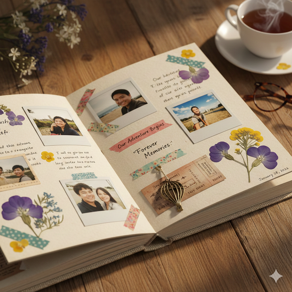 Nothing says “I cherish our journey” like a scrapbook filled with photos, tickets, notes, and little memories from your time together.