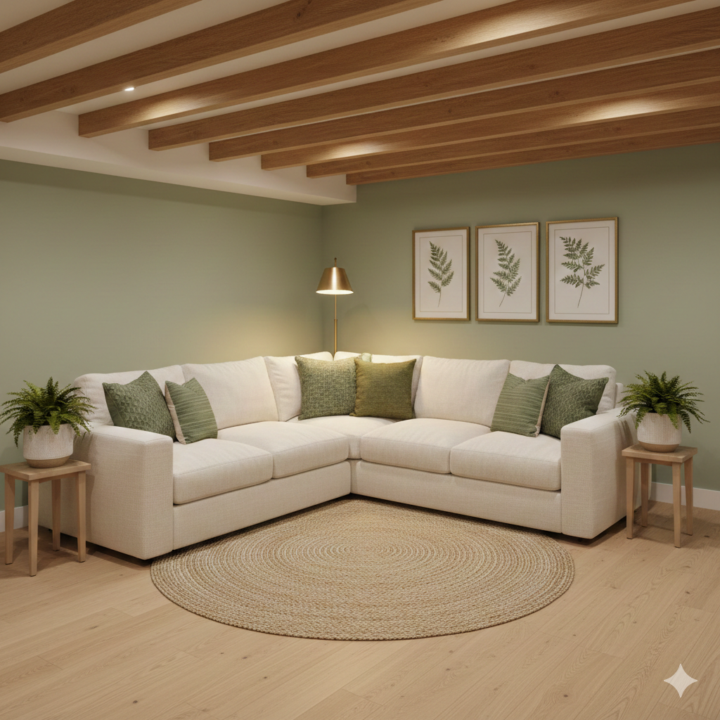 Sage green works beautifully in smaller basements because it feels airy yet grounded — never overwhelming.