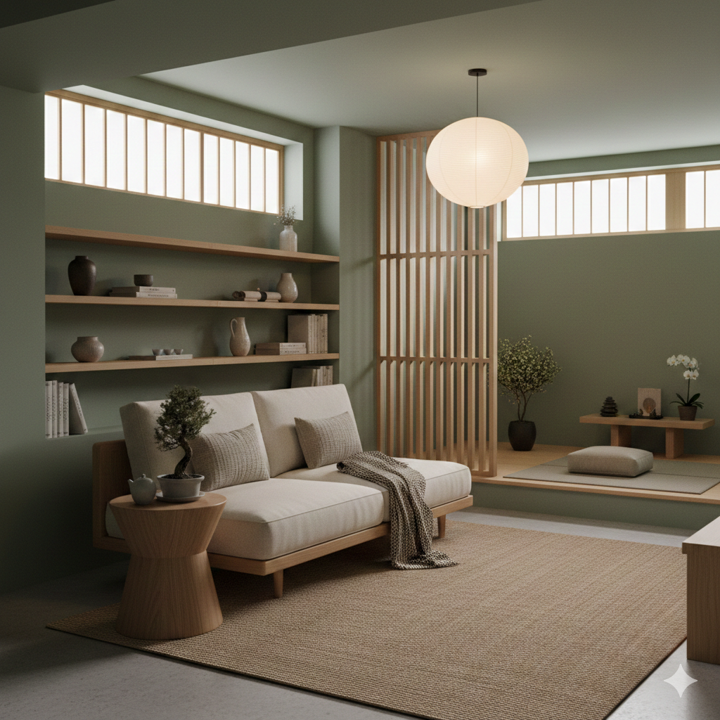 If you love calm, clutter-free design, combine sage green with Japandi style. This design blends Japanese minimalism with Scandinavian warmth — making it ideal for basements that need serenity.