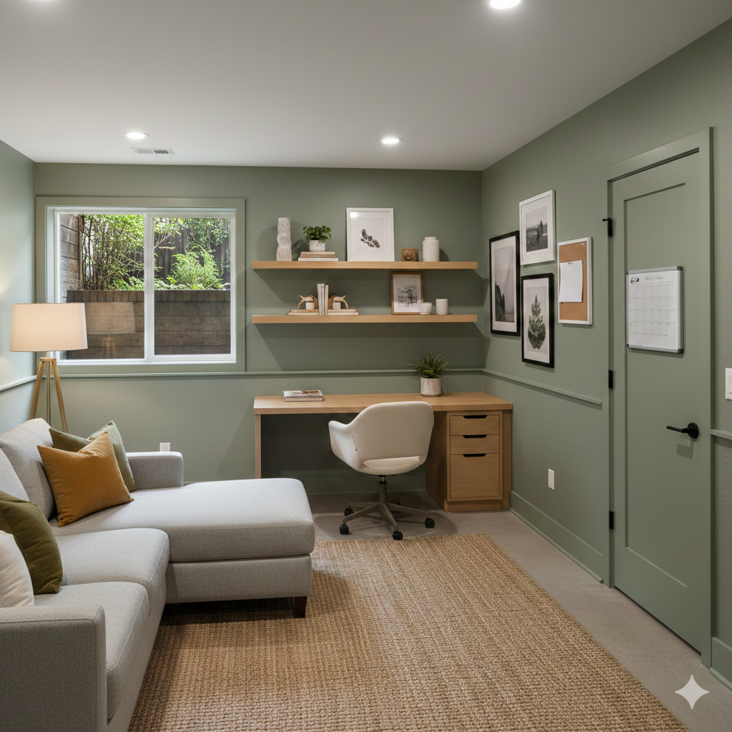 Basements often lack natural light, which is why color choice matters so much. A light sage green on the walls reflects available light better than darker shades while still adding personality.