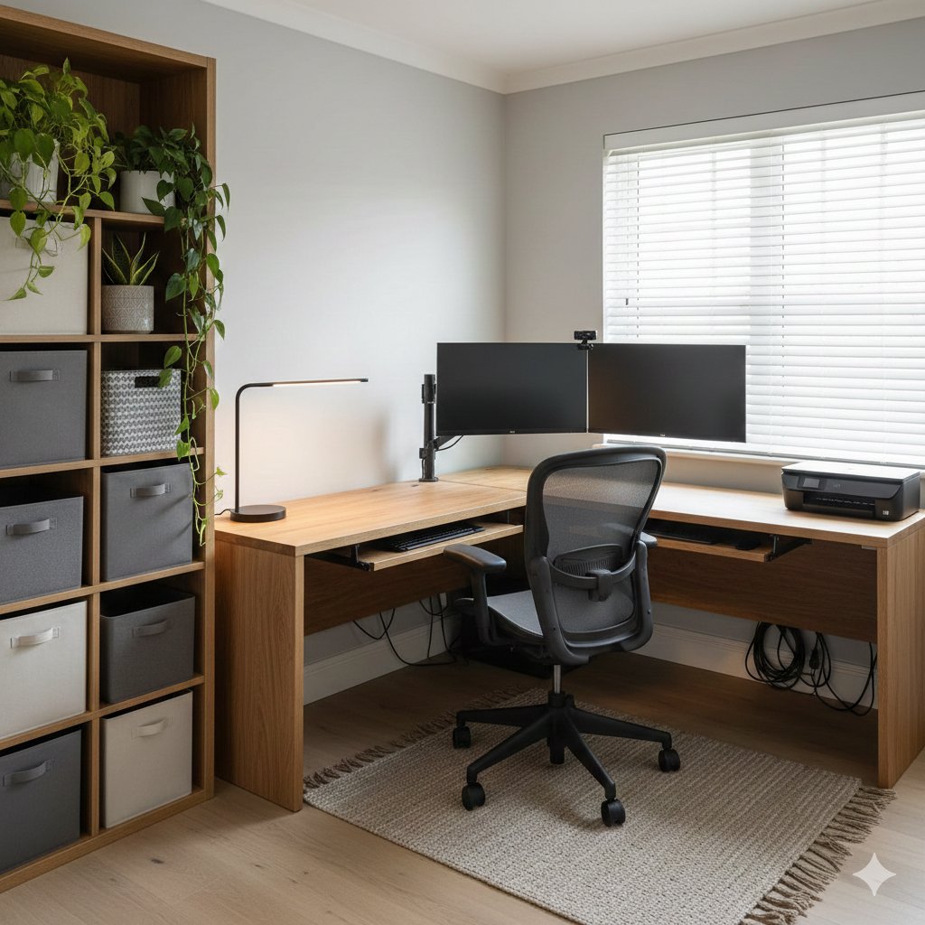 Organization is key in a dual-purpose room. A cluttered space can hinder both work and relaxation.