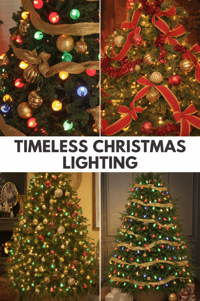 Let’s start with a timeless favorite — the traditional red, green, gold, and blue lights. This look instantly sparks nostalgia, bringing back memories of cozy nights by the fire and laughter-filled family gatherings.