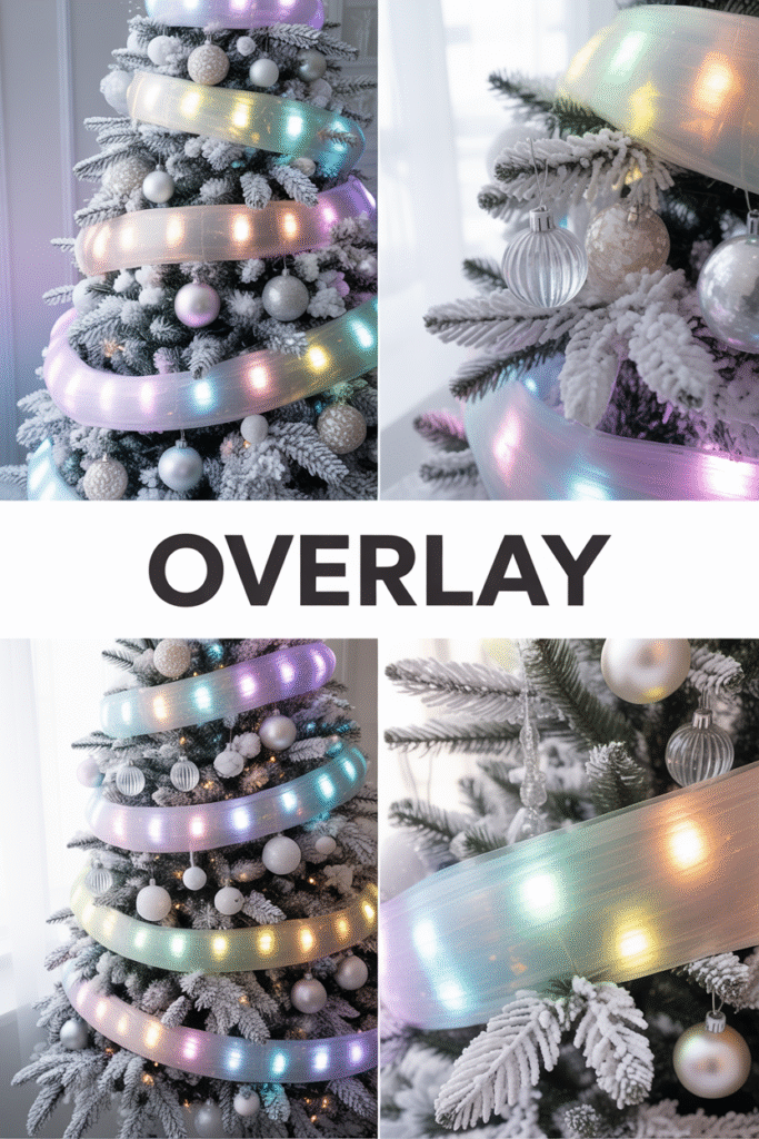 To create this ethereal effect, combine warm and cool tones in your lighting. Add layers of white tulle or iridescent mesh for that “floating” glow, and finish with a star or angel topper that twinkles beautifully.