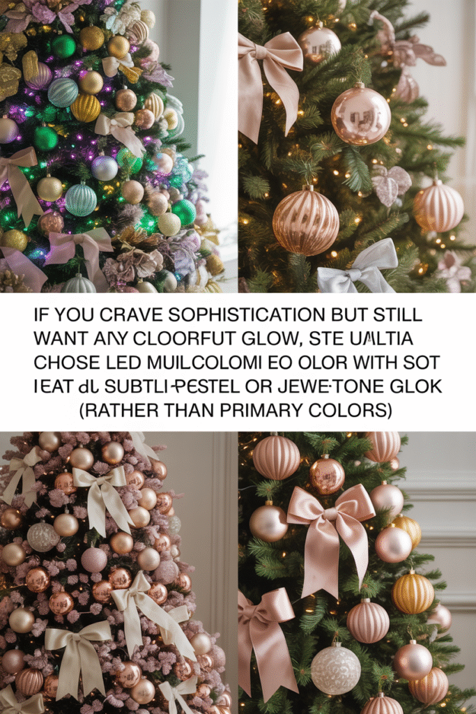 - Don’t forget the tree skirt: A metallic or reflective base will amplify your colorful glow beautifully.