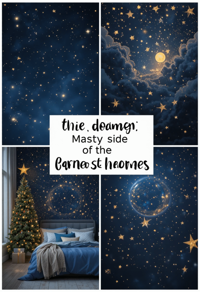 A deep navy background sprinkled with golden stars evokes the peaceful side of Christmas — perfect for night owls who love a dreamy, celestial touch.