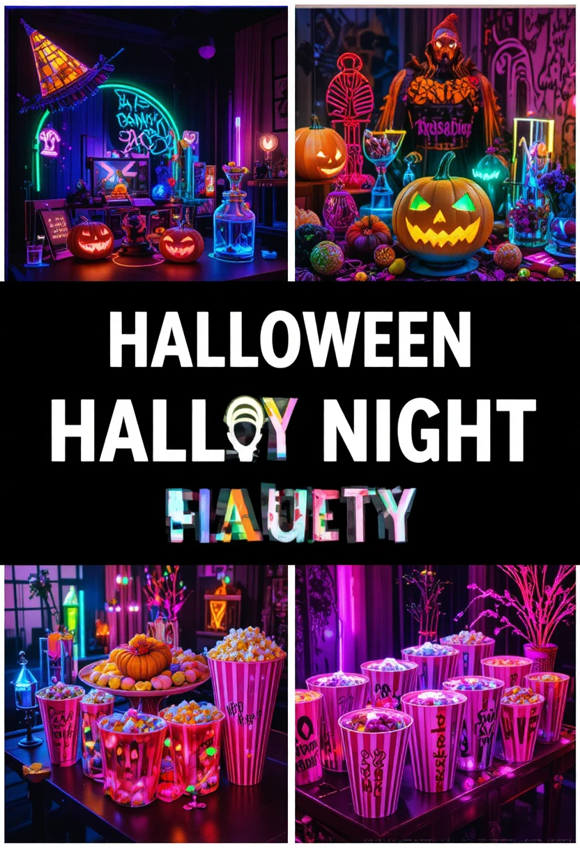 If you prefer a modern, fun twist, try a neon Halloween setup. Blacklights, glowing pumpkins, and neon-painted props will give your movie night a vibrant, Instagram-worthy aesthetic.