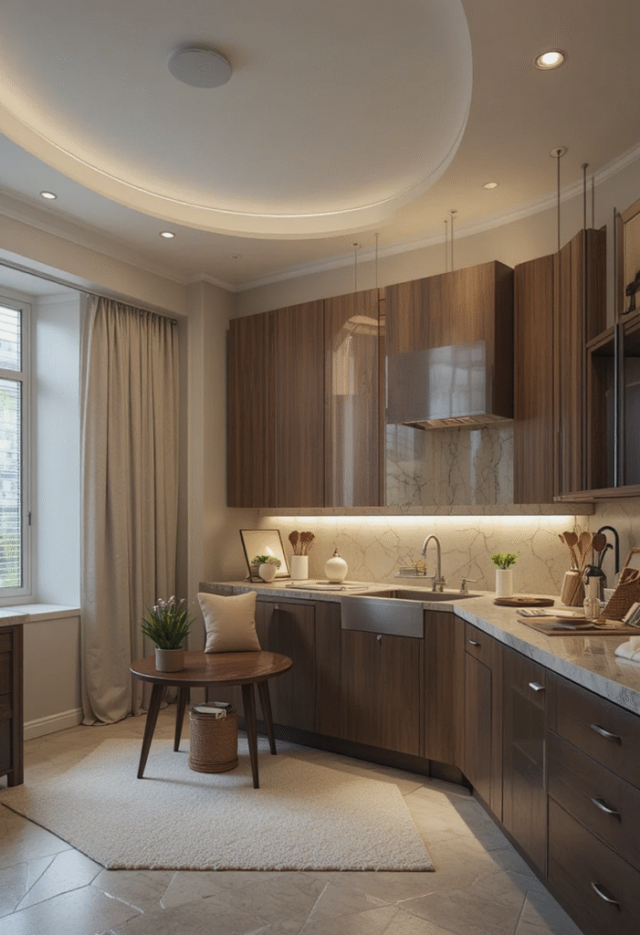 - Add small lights near open shelving to highlight wood grain or decorative objects.