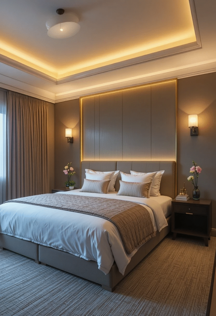 - Use warm LED strip lighting behind the headboard for subtle glow.