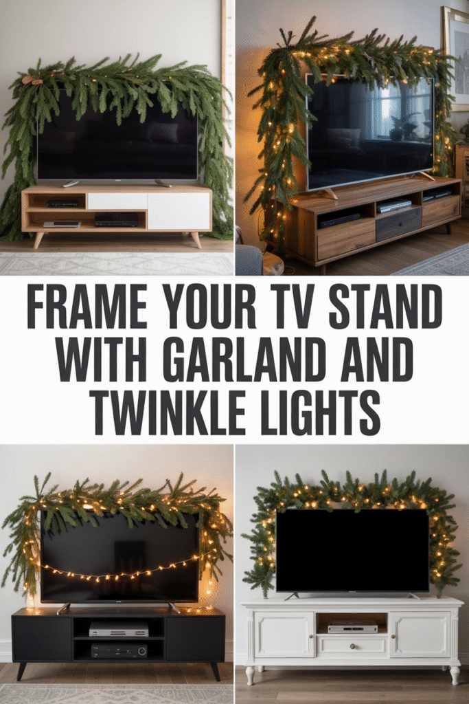 To keep things balanced, avoid blocking the TV screen. Instead, hang the garland slightly above the TV or place it along the top edge of the console. You can even add pinecones, berries, or miniature ornaments for a natural woodland touch.