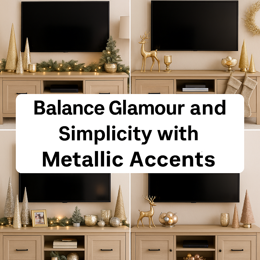 For those who love a touch of glam, incorporate metallic accents into your Christmas TV stand styling. Think gold candleholders, silver reindeer figurines, or a few metallic baubles scattered across the console.