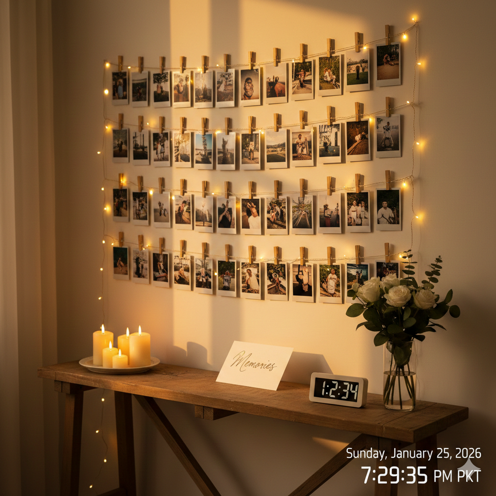 Print your favorite photos together and create a “memory wall” overnight. Decorate it with fairy lights, heart cutouts, and love notes.