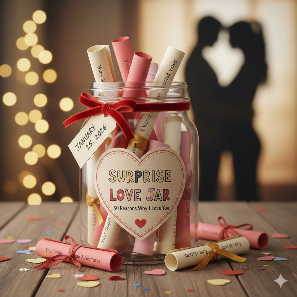 Fill a jar with 50 tiny notes, each listing a reason why you love your partner. Decorate the jar with ribbons and hearts.