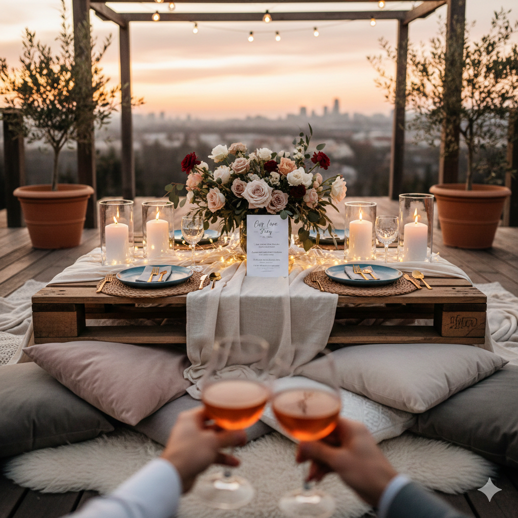 If you have access to a balcony or rooftop, decorate it with lights, cushions, and candles for a private romantic date under the sky.
