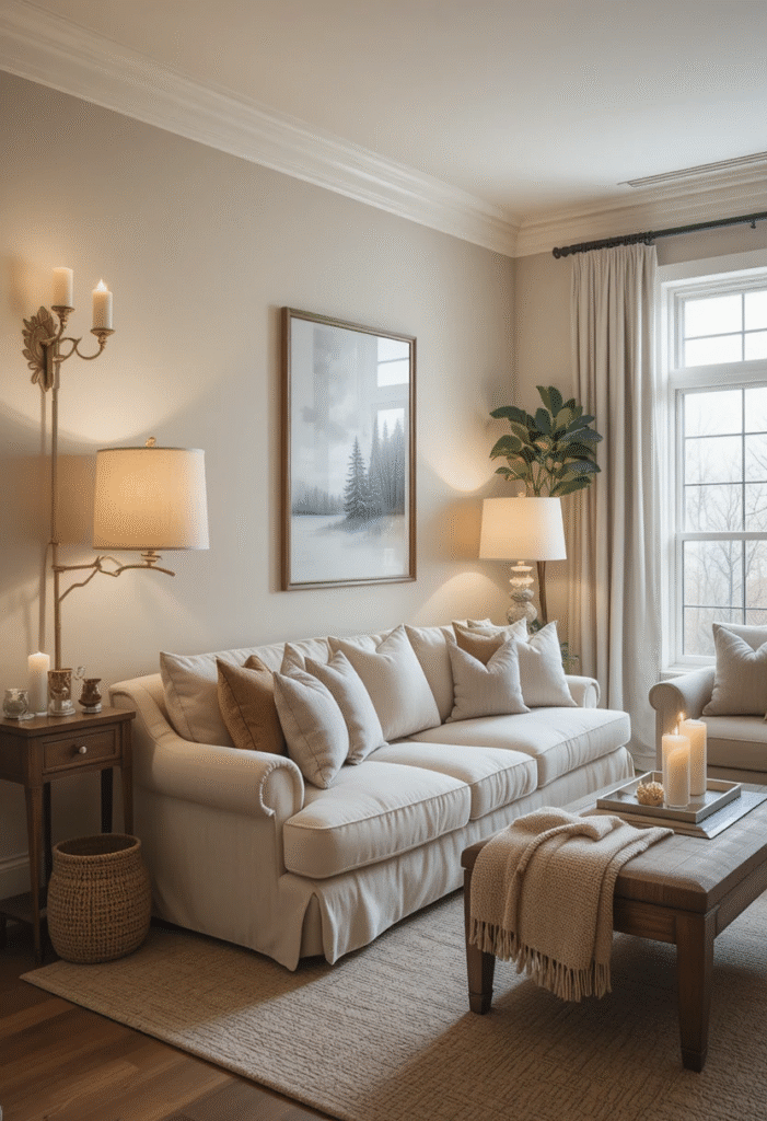 Lighting can completely change how a neutral room feels.