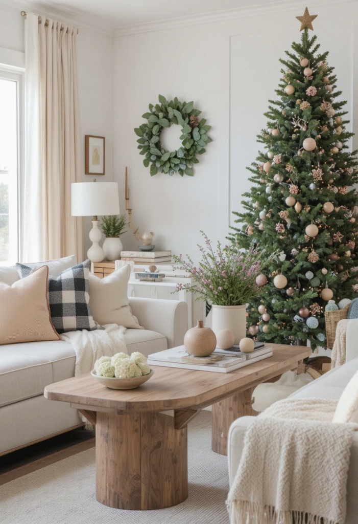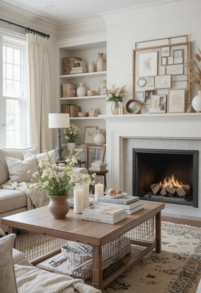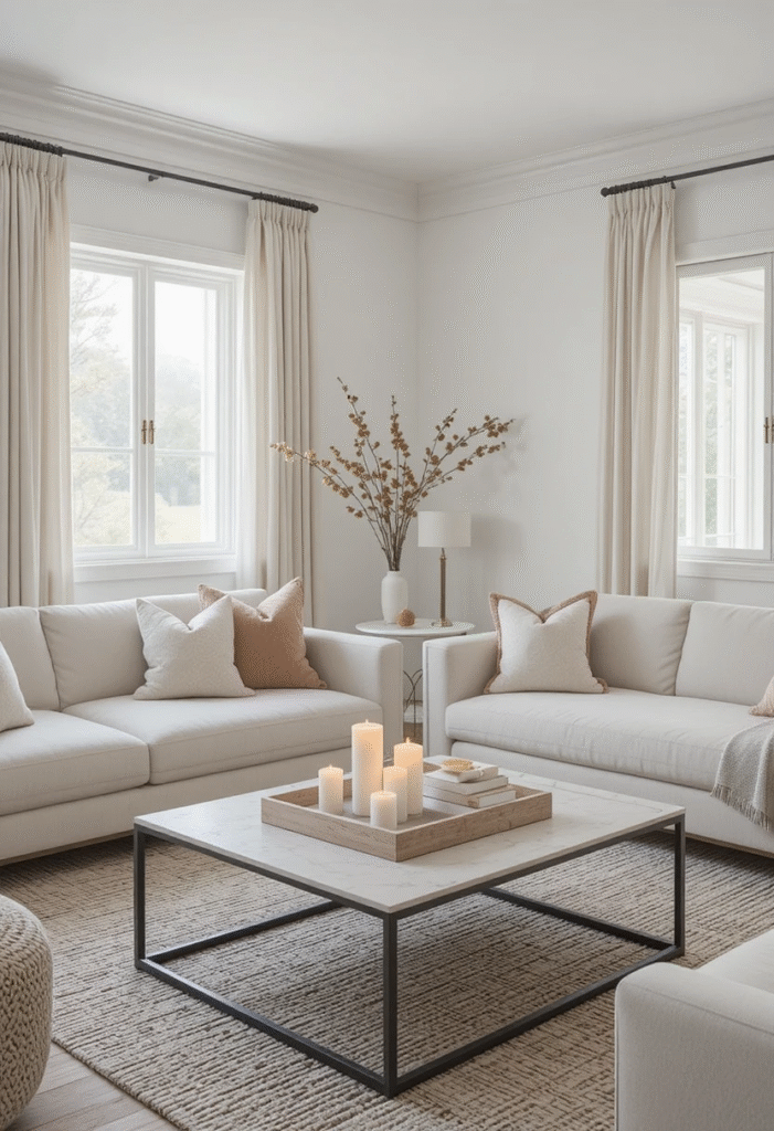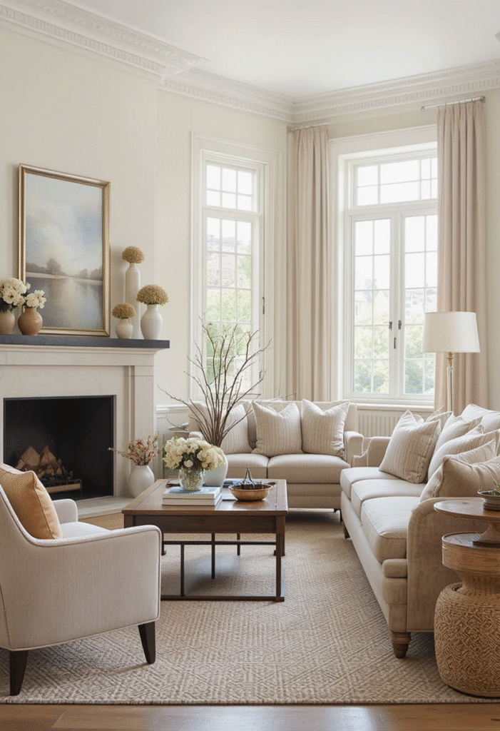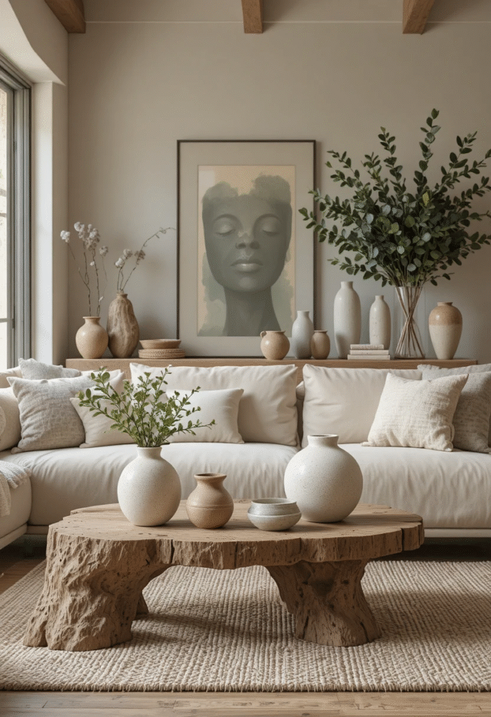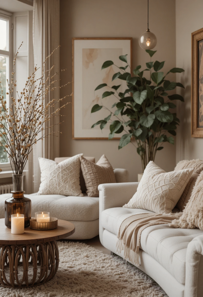 Wood, greenery, stone, and organic fibers prevent neutrals from feeling flat. Even small additions—like a wooden coffee table tray or a ceramic planter—make a noticeable difference.