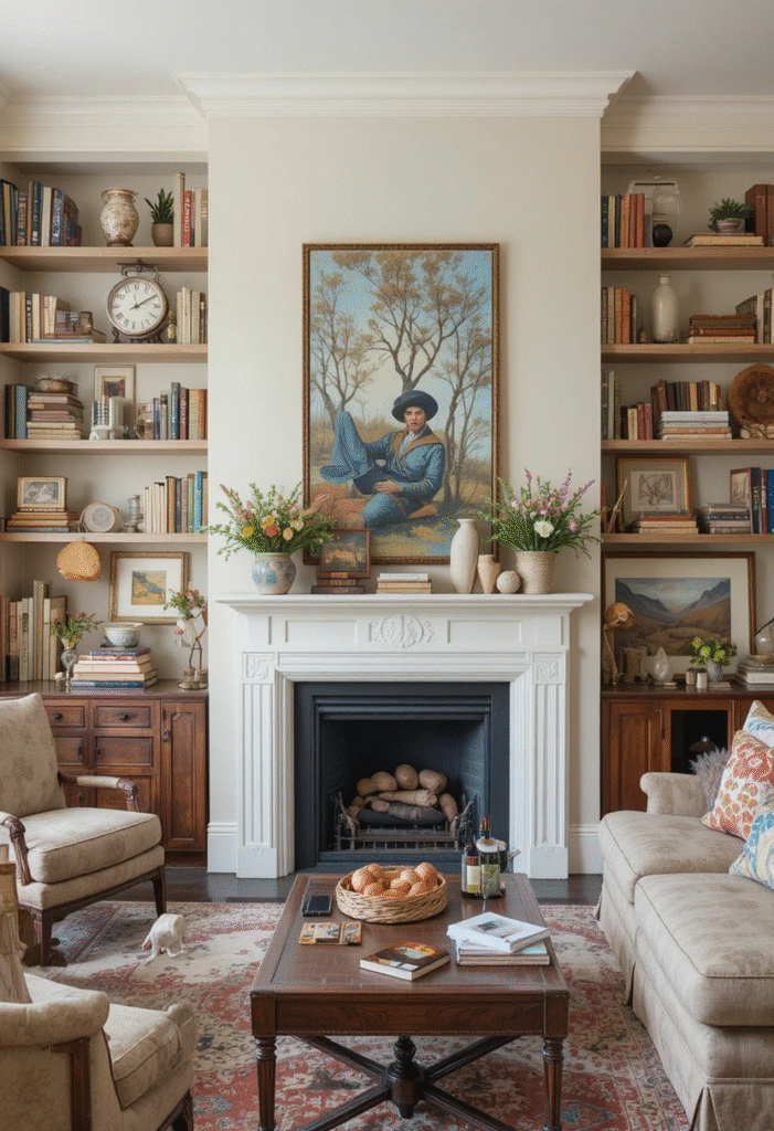 Avoid overly symmetrical or rigid layouts. Instead, aim for collected, lived-in styling. Mix framed prints, stacked books, and personal objects.